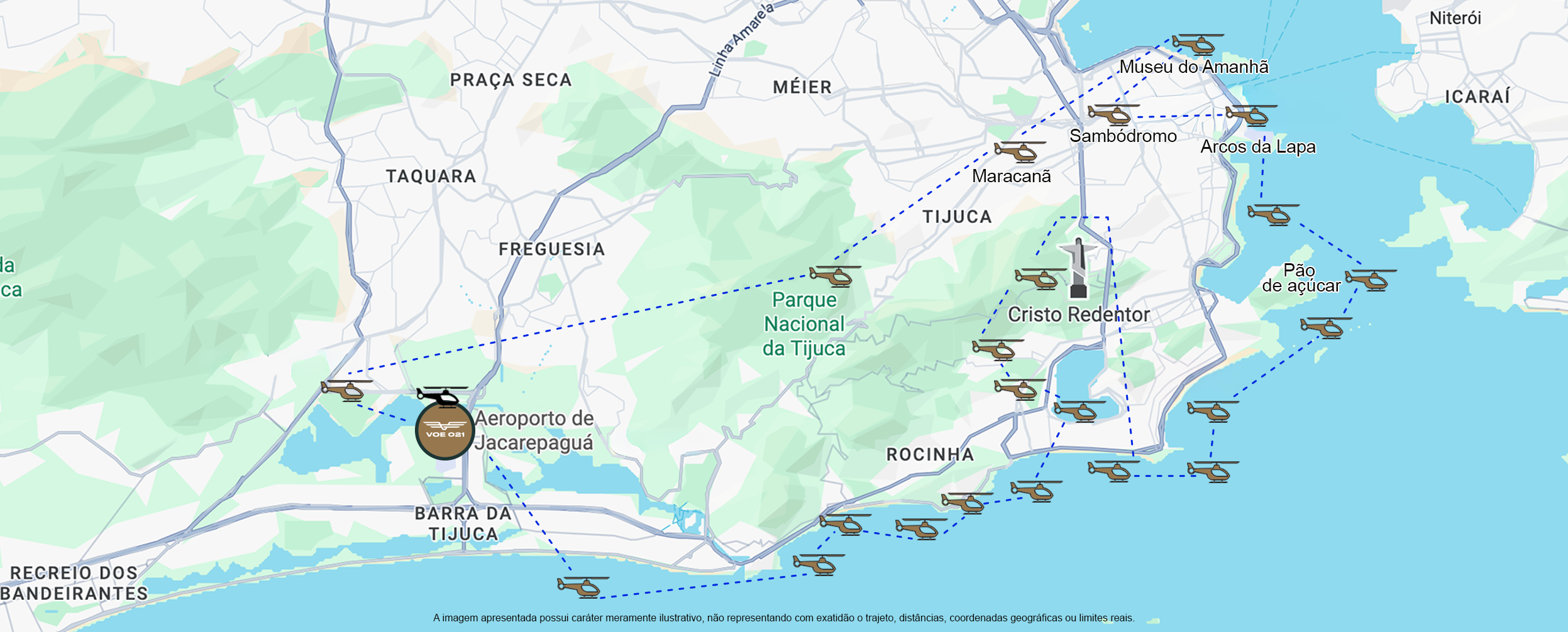 Base Voe 021 | Praias da Barra da Tijuca | Praia da Joatinga | Pedra da Gávea | Praia de São Conrado | Rocinha | Morro Dois Irmãos | Praia do Leblon | Lagoa Rodrigo de Freitas | Jockey Club | Jardim Botânico | Cristo Redentor | Praia de Ipanema | Praia do Arpoador | Praia de Copacabana | Praia Vermelha | Vista do Pão de Açúcar | Praia de Botafogo | Aterro do Flamengo | Arcos da Lapa | Sambódromo | Museu do Amanhã | Estádio Maracanã | Floresta da Tijuca | Parque Olímpico | Retorna Base Voe 021