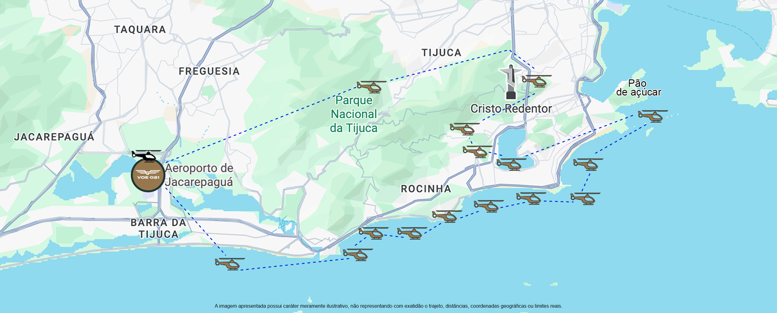 Base Voe 021 | Praias da Barra da Tijuca | Praia da Joatinga | Pedra da Gávea | Praia de São Conrado | Rocinha | Morro Dois Irmãos | Praia do Leblon | Praia de Ipanema | Praia do Arpoador | Praia de Copacabana | Praia Vermelha | Vista do Pão de Açúcar | Lagoa Rodrigo de Freitas | Jockey Club | Jardim Botânico | Cristo Redentor | Floresta da Tijuca | Retorna Base Voe 021