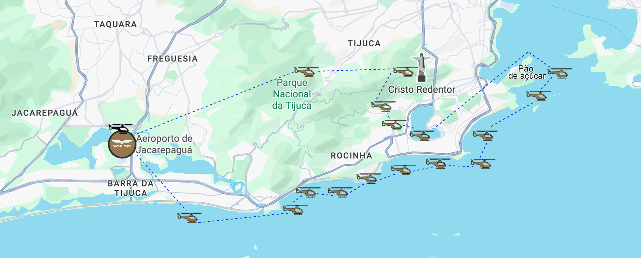 Base Voe 021 | Praias da Barra da Tijuca | Praia da Joatinga | Pedra da Gávea | Praia de São Conrado | Rocinha | Morro Dois Irmãos | Praia do Leblon | Praia de Ipanema | Praia do Arpoador | Praia de Copacabana | Praia Vermelha | Vista do Pão de Açúcar | Lagoa Rodrigo de Freitas | Jockey Club | Jardim Botânico | Cristo Redentor | Floresta da Tijuca | Retorna Base Voe 021